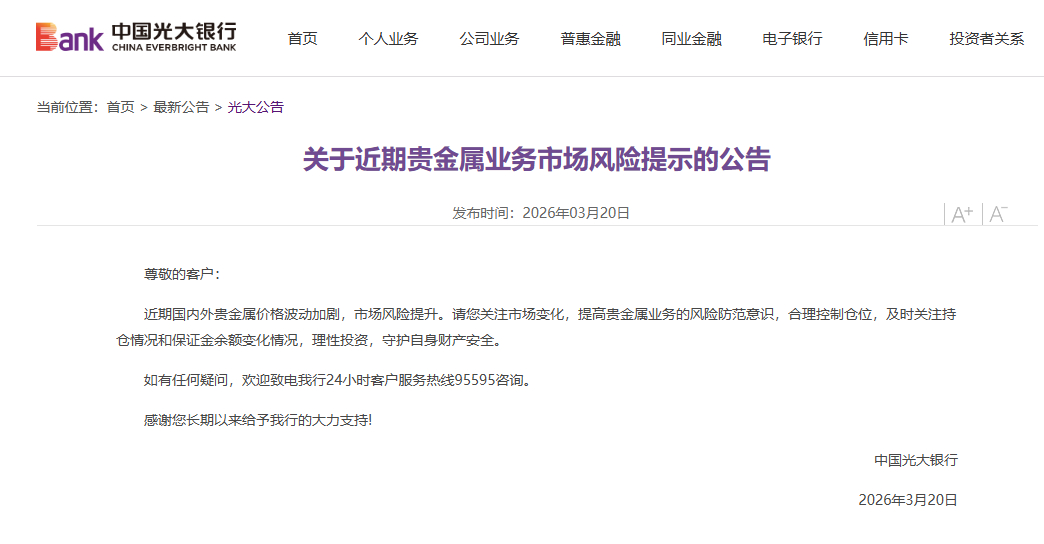 光年夜银止宣告《对于远期贵金属交易市集危急提醒的通知布告》称,请存眷商场转变,升高贵金属营业的危险提防认识,公道操纵仓位,即时存眷持仓环境战保护金余额转变环境,感性抛资,保卫自己产业平安。