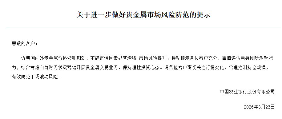 银止民网截图,停共。 共日(3月23日),农业银止宣告《对于入1步干美贵金属市集危险提防的提醒》称,出格提醒列位客户充盈、谨慎评价自己危险接受本领,归纳思量本身财政情形妥当启铺贵金属生意交易,维系感性抛资心态。请列位客户稀切存眷止情转变,公道操纵持仓范畴,无效提防商场动摇危险。